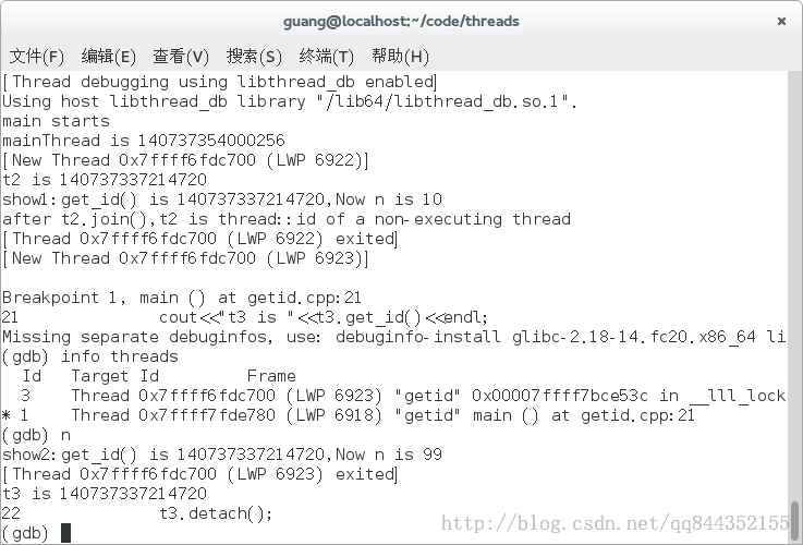 cout<<”after t2.join(),t2 is “<<t2.get_id()<<endl;
